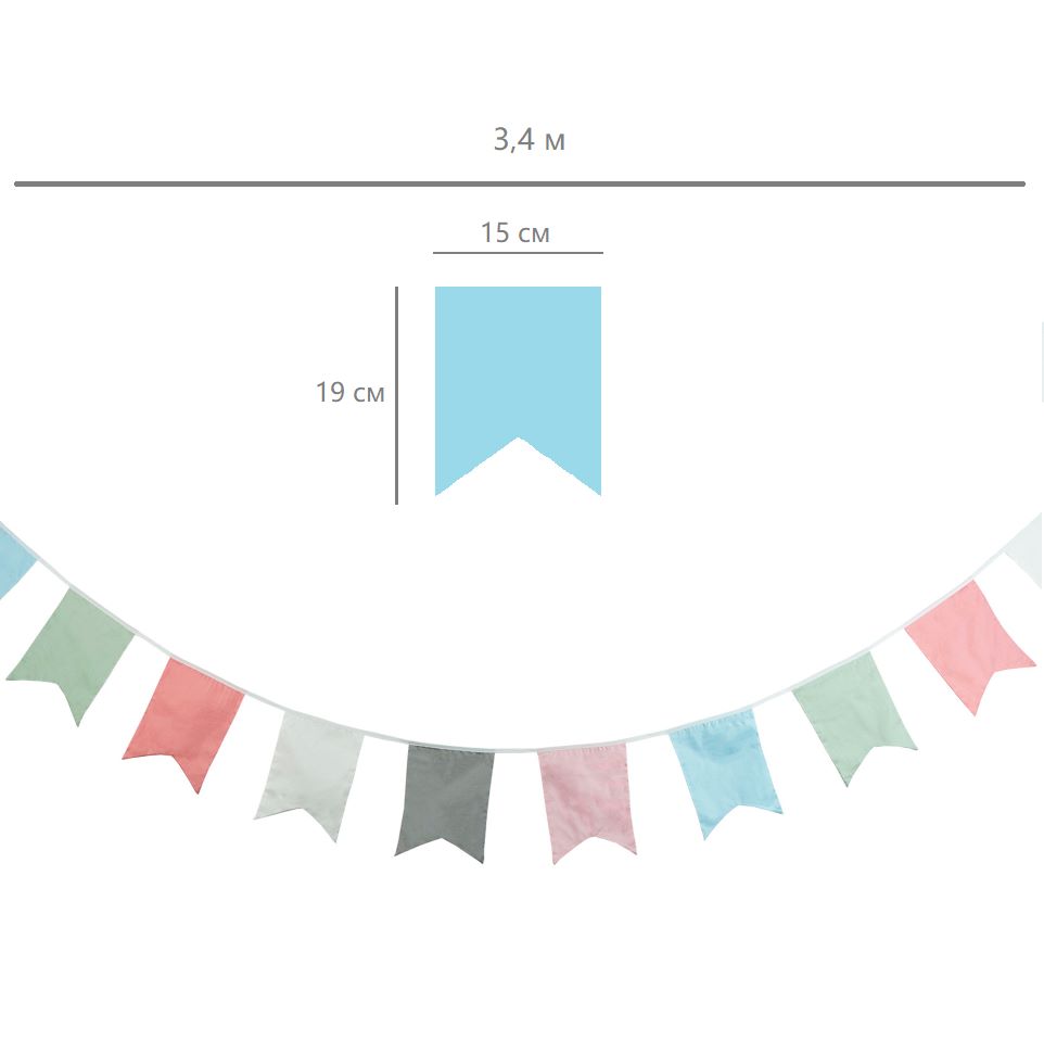 Гирлянда состоит из 12 флажков, общая длина составляет 3,4 м, расстояние между флажками 3 см, длина матерчатых флажков 2,1 м, длина лямок с обеих сторон по 50 см
