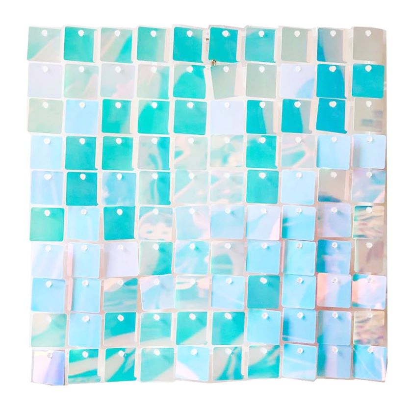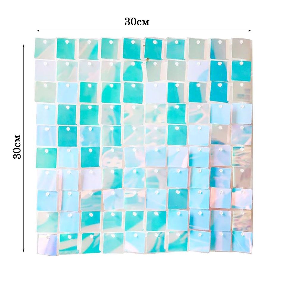 Панель с пайетками 30×30 см на гибкой пластиковой основе. Пластик прочный, хорошо гнётся и не ломается при сгибании. Пайетки переливаются при движении. Панель крепится к стенам, каркасам или соединяется с другими такими же панелями.