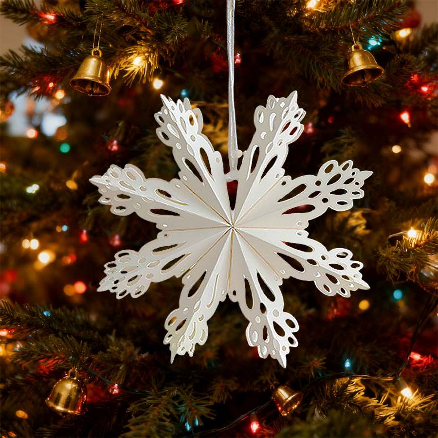 Конструкция продумана до мелочей: верхние концы соединяются встроенными магнитами, что позволяет легко складывать и раскладывать снежинку без клея и дополнительных креплений. Для подвешивания предусмотрена тонкая ленточка из органзы — изделие удобно разместить на окне, потолке или ёлке.