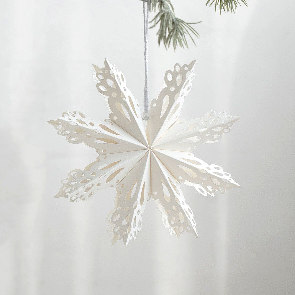 Элегантная объёмная снежинка из плотной бумаги белого цвета — изысканное украшение для зимнего интерьера, витрин, залов и новогодних фотозон. Ажурный рисунок придаёт ей лёгкость и воздушность, создавая ощущение снежной свежести и уюта.