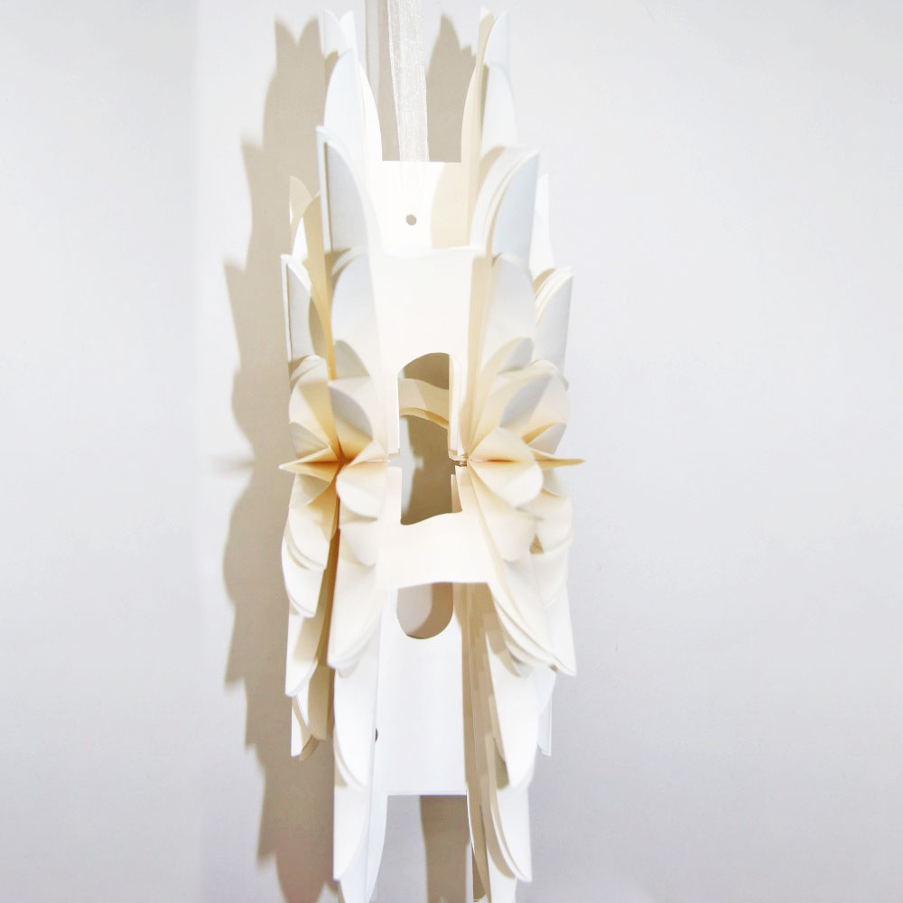 Верхние концы конструкции соединяются встроенными магнитами — снежинка легко складывается и фиксируется без клея и лишних креплений. Для подвешивания предусмотрена тонкая ленточка из органзы, благодаря которой украшение удобно разместить на окне, потолке или новогодней ёлке.